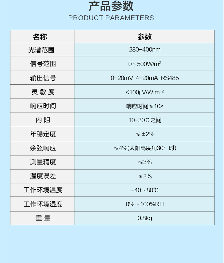 TBQ-UVAB紫外輻射傳感器用于測量和記錄環(huán)境中280-400nm的紫外輻射強度的一款高性能的環(huán)境監(jiān)測設(shè)備。產(chǎn)品特點在于其高精度、快速響應(yīng)和穩(wěn)定性強,能夠準確捕捉并反映紫外輻射的變化情況。無論是在氣象觀測、環(huán)境監(jiān)測、皮膚健康研究還是戶外工作場所的安全評估中,紫外輻射表都發(fā)揮著至關(guān)重要的作用。它能夠幫助我們更好地了解紫外輻射對環(huán)境及人體健康的影響,為相關(guān)領(lǐng)域的科研、政策制定及安全預(yù)警提供有力支持。