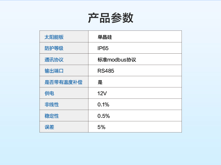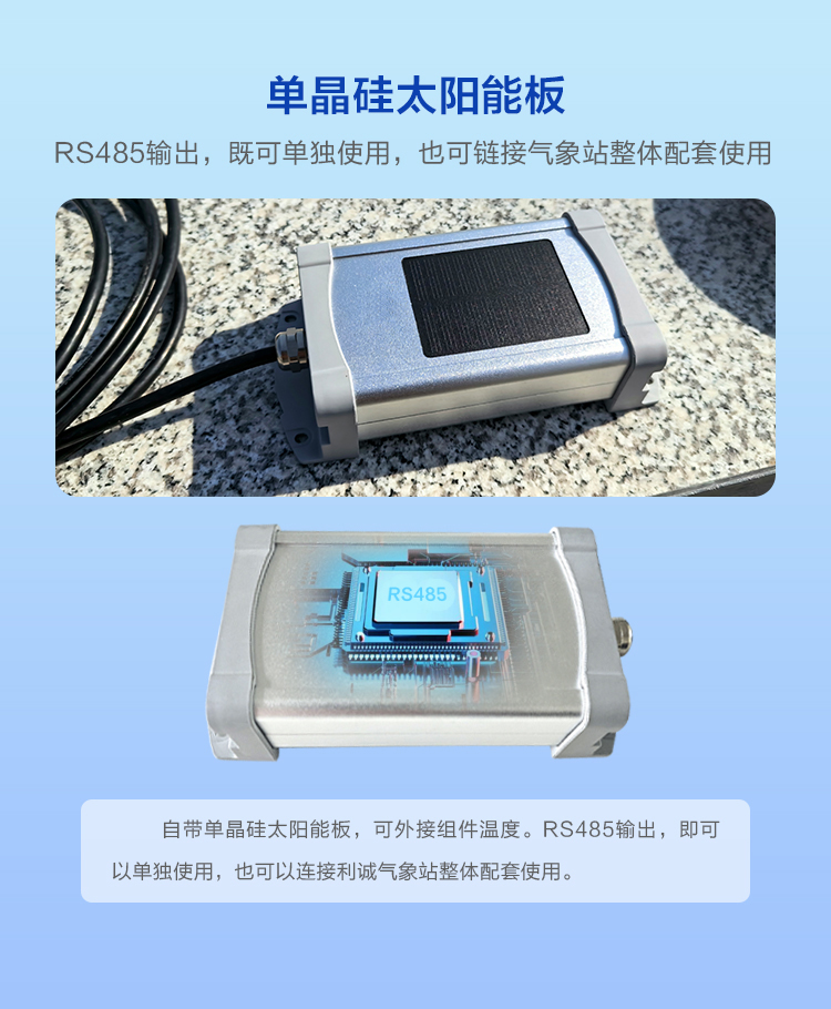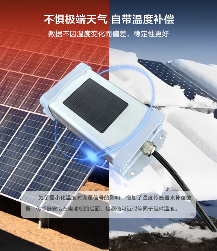 硅基輻照計是一款低成本、測量數(shù)據(jù)準確的輻照度傳感器,可用于評估光伏發(fā)電系統(tǒng)效率。其傳感器的本身,采用硅基結(jié)構(gòu)與光伏組件的結(jié)構(gòu)相似,特別是它的光譜響應(yīng)以及傾斜誤差都與光伏組件極其相似,這讓使用硅基傳感器來精準的分析光伏組件輻照度數(shù)據(jù)有據(jù)可循。