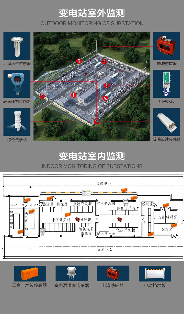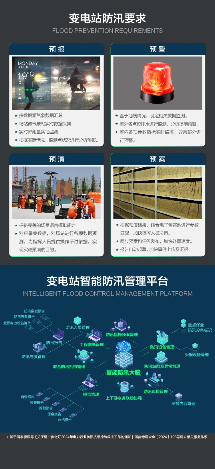 基于“構(gòu)建變電站防汛“四預(yù)”(預(yù)報、預(yù)警、預(yù)演、預(yù)案)體系”的提升耐汛能力要求,我們針對變電站存在特點、結(jié)合無人值守變電站狀態(tài)、不同級別變電站策略要求特提供以下策略針對無人值守 變電站、市重點變電站省重要節(jié)點(國級)變電站提供一體化抗洪抗?jié)辰鉀Q方案。