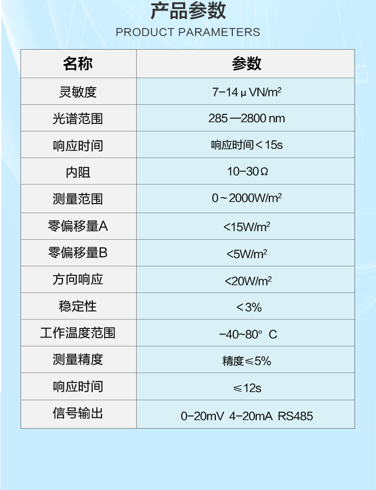 TBQ-2LJ總輻射傳感器(光電)是一種用于測量太陽輻射等電磁輻射的儀器。該表由一個光電二極管、一個濾光器和一個電路組成。在使用時,將儀器暴露在太陽下,太陽光經(jīng)過濾光器后照射在光電二極管上,產(chǎn)生電流信號,電路通過放大電流信號并計算即可得到總輻射值。該儀器廣泛應用于氣象、農(nóng)業(yè)、環(huán)境等領(lǐng)域,用于測量太陽輻射、土壤表面輻射等指標,具有測量準確、數(shù)據(jù)處理方便等優(yōu)點。