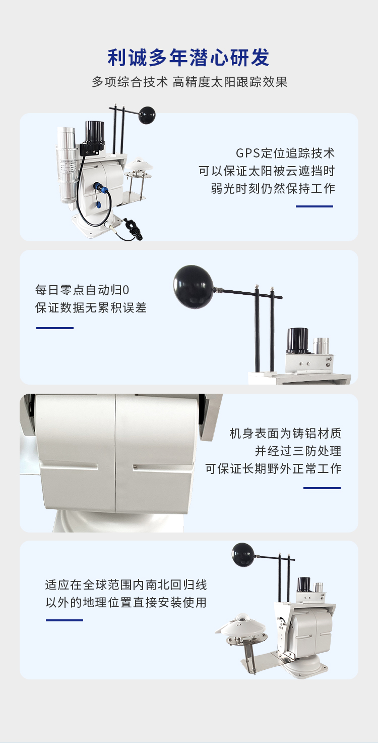TBS-2LGG-1全自動太陽能跟蹤儀是目前無人值守型太陽輻射儀器,解決了國內太陽輻射儀器需人工維護的弊病(特別是直接輻射與散射輻射),滿足了全自動化測量的要求,它是將機器人控制技術與輻射儀器完美結合的產品, 系統采用光追蹤+旋轉角度測量+光照強度測量+跟蹤運行等綜合技術, 可保證高精度的跟蹤太陽。